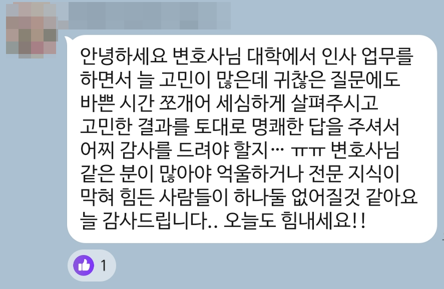 고객후기 [고객후기] '명쾌한 답을 주셔서 어찌 감사를 드려야 할지..' 고객의 감사메시지 부산변호사 2025. 11. 30. 21:45 고객으로부터 감사메시지를 받으면 언제나 힘이 납니다. 고객 여러분들이 만족할 만한 법률 서비스를 제공하기 위해 앞으로도 최선을 다하겠습니다 . 공유하기 게시글 관리 법무법인 시우 이용민 변호사 (051-503-6699) '고객후기' Related Articles [고객후기] 자문 잘 해주셔서 정말 큰 도움이 됐습니다. 즐거운 연말 보내시고 새해 복 많이 받으세요. [법무법인 시우 부산 이용민 변호사] [고객후기] 진짜 너무 힘들었는데 좋은변호사님 만나서 너무너무 잘되었습니다. [법무법인 시우 부산 이용민 변호사] [고객후기] 승소 소식에 기뻐하는 의뢰인 [부산 법무법인 시우 이용민 변호사] [고객후기] 벌금형의 집행유예로 만족한 고객의 카카오톡 메시지 [법무법인 시우 부산 이용민 변호사]