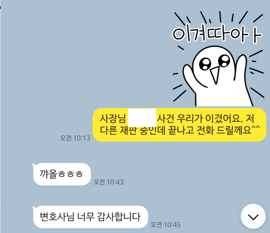 승소 소식을 전해드리자 의뢰인께서는 “변호사님 너무 감사합니다”라는 따뜻한 메시지를 보내주셨습니다.