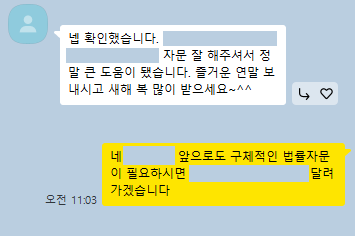 법무법인 시우 이용민 변호사는 고객께서 요청하신 법률자문 건을 충실히 수행하였고, 의뢰인께서는 자문 잘 해 주셔서 만족하셨고, 새해 복 많이 받으라는 격려의 메시지를 남겨 주셨습니다.