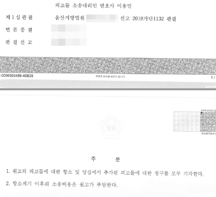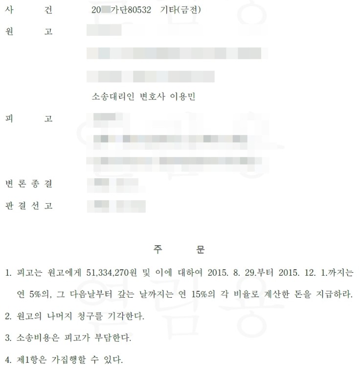 부산변호사는 민사사건에서도 원고, 피고를 대리하여 다수의 사건에서 성공적인 결과를 얻고 있습니다. 아래는 이용민 변호사가 받은 여러 승소사건들 중 일부 사건의 판결문입니다.