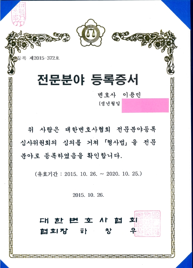 이용민 변호사 형사전문변호사 등록증