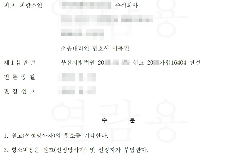부산변호사는 민사사건에서도 원고, 피고를 대리하여 다수의 사건에서 성공적인 결과를 얻고 있습니다. 아래는 이용민 변호사가 받은 여러 승소사건들 중 일부 사건의 판결문입니다.