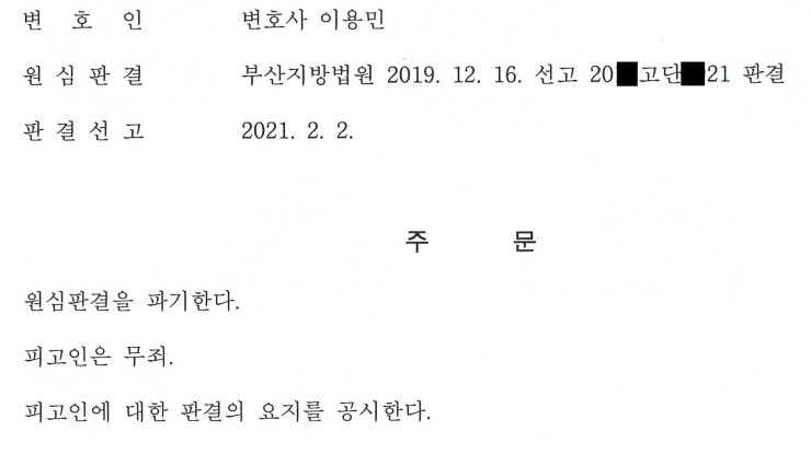 이용민 변호사는 수많은 형사사건에서 무죄, 무혐의 등 성공적인 결과를 얻고 있습니다. 아래는 1심에서 유죄판결을 받고 항소심에서 이용민 변호사를 선임하여 무죄판결을 받은 사건의 판결문입니다.