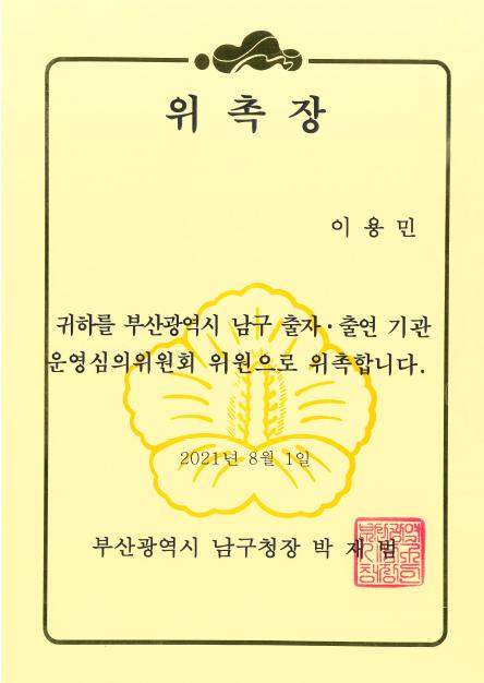 저희 법률사무소 이용민 변호사님께서 금년 8월 부산광역시 남구 출자, 출연기관 운영심의위원회 위원으로 위촉되셨습니다. 이용민 변호사님께서는 지금까지 다양한 외부 위원회에서 공정하고 엄정한 심사를 해오셨던바, 이러한 경력을 인정받아 부산광역시 남구 출자, 출연기관 운영심의위원회 위원으로 위촉될 수 있었습니다. 앞으로도 저희 법률사무소 시우의 구성원들은 고객이 만족하는 최선의 성과를 도출해 내기 위해 최선의 노력을 다하겠습니다. 감사합니다.