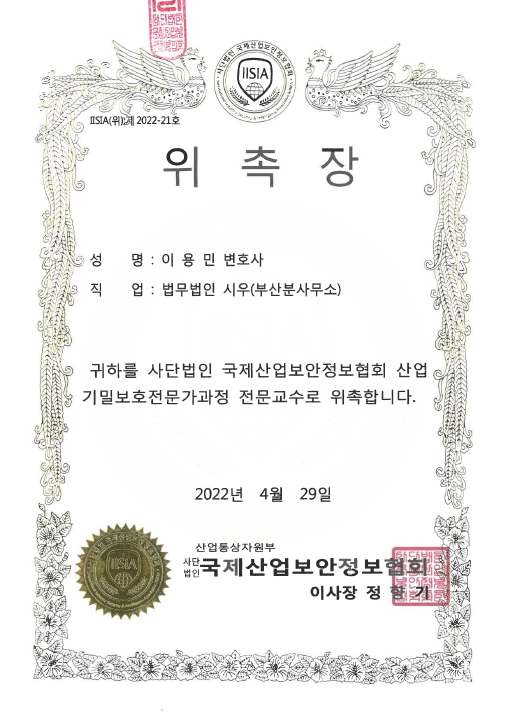 이용민 변호사는 2022. 4. 29. 동서대학교 U-IT관에서 (사)국제산업보안정보협회 강의교수로 위촉장을 수여 받았습니다. 이용민 변호사는 영업비밀, 산업보안을 주제로 다년간 여러 기관에서 강의하였고 관련된 여러 자문, 소송 사건을 수행한 경험이 있습니다. 상담 또는 사건의뢰가 필요하신 분들은 언제든지 연락 주시기 바랍니다.