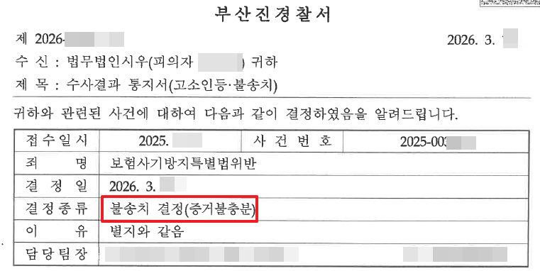 법무법인 시우 부산사무소의 이용민 변호사는, 다수의 보험을 가입하고, 여러 차례 오랜 기간의 입원한 사실관계와 관련하여 보험사기방지특별법위반등으로 수사를 받고 있던 의뢰인을 변호하였습니다. 철저한 분석을 통한 변호인의견서 작성, 여러 차례에 걸친 피의자신문 수사과정의 동행과정을 거쳤고, 결국 2026. 3. 부산진경찰서는 의뢰인에 대하여 불송치결정, 즉 혐의가 없다는 취지로 판단을 하였습니다.
