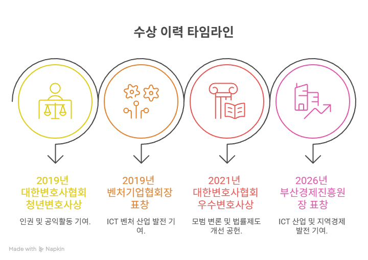 또한 2026년 1월 26일에는 부산경제진흥원장 표창을 수상하였습니다. 사단법인 부산정보기술협회 회원으로서 산·학·연·관 네트워크 구축에 힘쓰고, 기술정보 교류 활동을 통해 회원사의 이익 증진은 물론 ICT 벤처산업과 지역경제 발전에 기여한 점이 높이 평가된 것입니다. 이를 통해 이용민 변호사는 법률 분야뿐 아니라 지역 산업과 경제 활성화에도 꾸준히 관심을 가지고 실천해 온 전문가라는 점을 다시 한번 확인할 수 있습니다.
