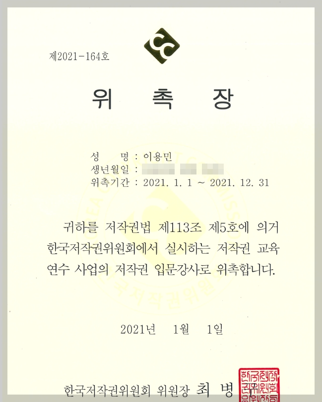 이용민 변호사는 2014년부터 다년간 저작권 자문, 교육을 계속해 오고 있으며, 한국저작권위원회의 저작권 관련 심사, 강의 등 다양한 업무를 수행해 오고 있습니다.