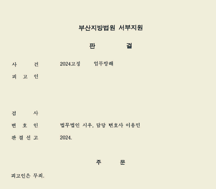 법무법인 시우 부산 이용민 변호사는 부산지방법원 서부지원 업무방해 사건에서 피고인에 대한 전부 무죄 판결을 이끌어 내었습니다.