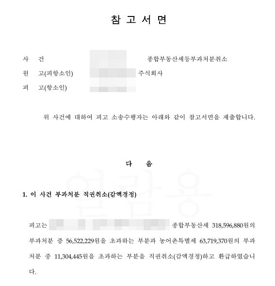 저희 법률사무소 이용민 변호사님께서 최근 부산지방법원 20XX구합23064 종합부동산세등취소처분청구 사건에서 의뢰인에 대한 승소판결을 이끌어 낸 적이 있었고, 이에 대하여 처분청이 항소를 하여 항소심을 진행하는 도중, 처분청이 다투던 처분을 취소하고 처분 취소부분에 해당하는 종합부동산세와 농어촌특별세 314,489,576원 및 이에 대한 이자를 의뢰인에게 전액 환급하였습니다.