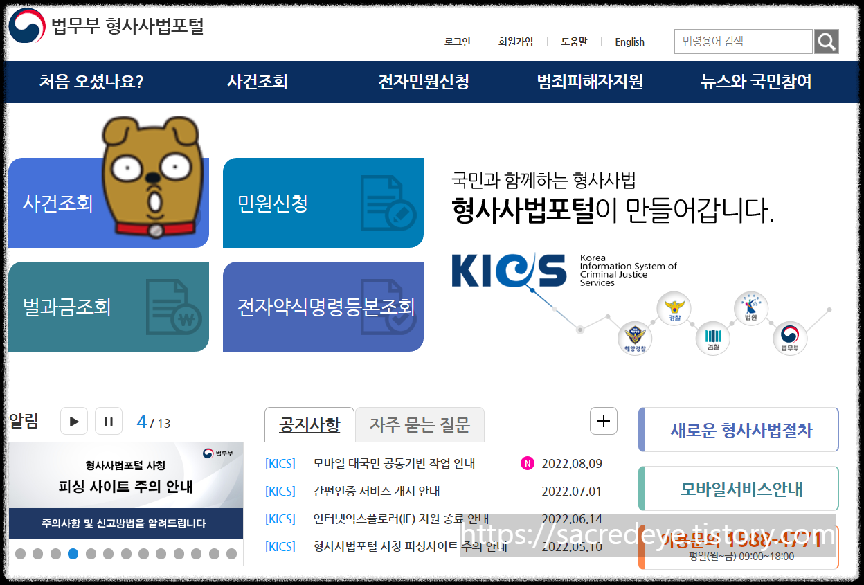 오늘은 형사사법 포털에서 사건 정보를 조회하는 방법을 알려드립니다. 형사사법포털에서는 형사사건 중 수사 중인 사건의 정보를 아주 간략하게 조회할 수 있는데요.
