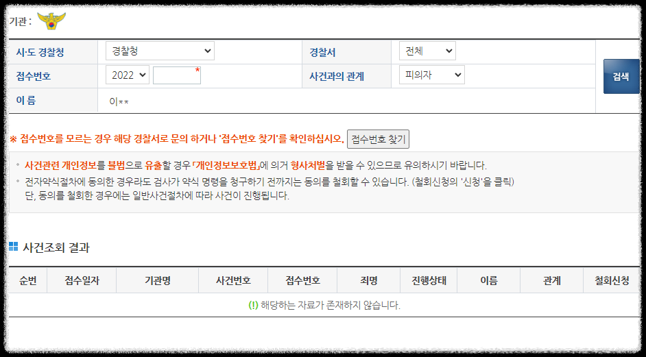 경찰사건조회 화면