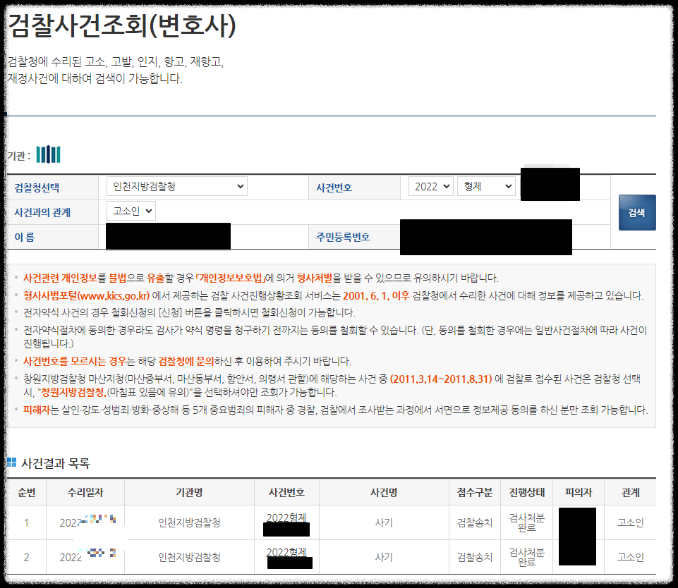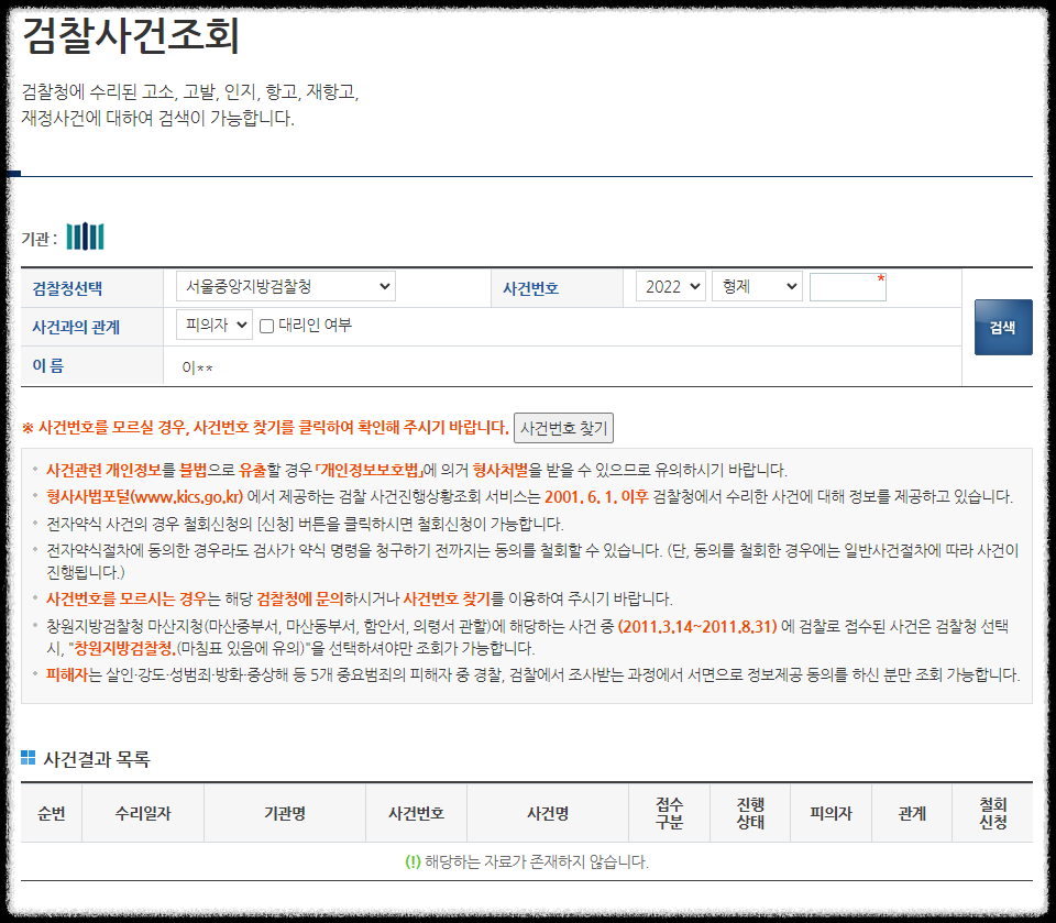 물론 흔하지는 않지만 일부 형사사건의 경우 위 형사사법포털을 이용하여 조회가 전혀 되지 않는 사건들도 있습니다.