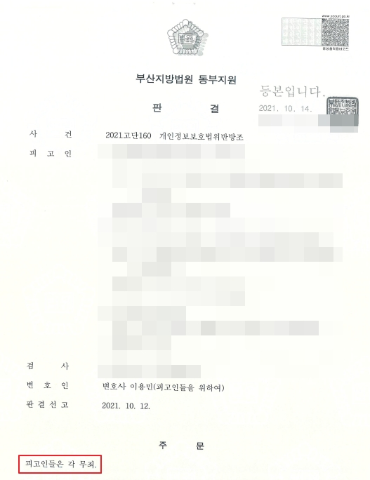 [형사] 개인정보보호법위반방조 사건에서 무죄 선고(부산지방법원 동부지원 2021고단1XX)<부산개인정보변호사><무죄변호사>