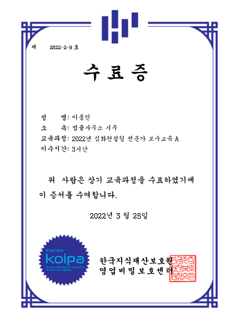 저희 법률사무소의 이용민 변호사님께서 2022. 3. 25. 한국지식재산보호원 영업비밀보호센터 영업비밀 심화컨설팅 보수교육을 수료하였습니다. 이용민 변호사님은 부산, 경남 지역의 여러 기업들을 대상으로 영업비밀 기초, 심화컨설팅을 수행하고 있으며 오랜 기간 동안 이와 관련하여 수많은 강의 및 사건을 성공적으로 수행하였습니다. 법률사무소 시우의 구성원들은 기업의 영업비밀을 보호하고 침해를 예방하기 위한 강의, 컨설팅과 침해가 발생한 경우 해당 사건의 형사고소, 진정대리, 형사변호, 내용증명발송, 손해배상청구 등 다양한 업무를 수행하고 있습니다. 저희 법률사무소 시우의 구성원들은 앞으로도, 다양한 분야에서 폭넓게 활동하며 능력을 인정받고자 합니다. 감사합니다.